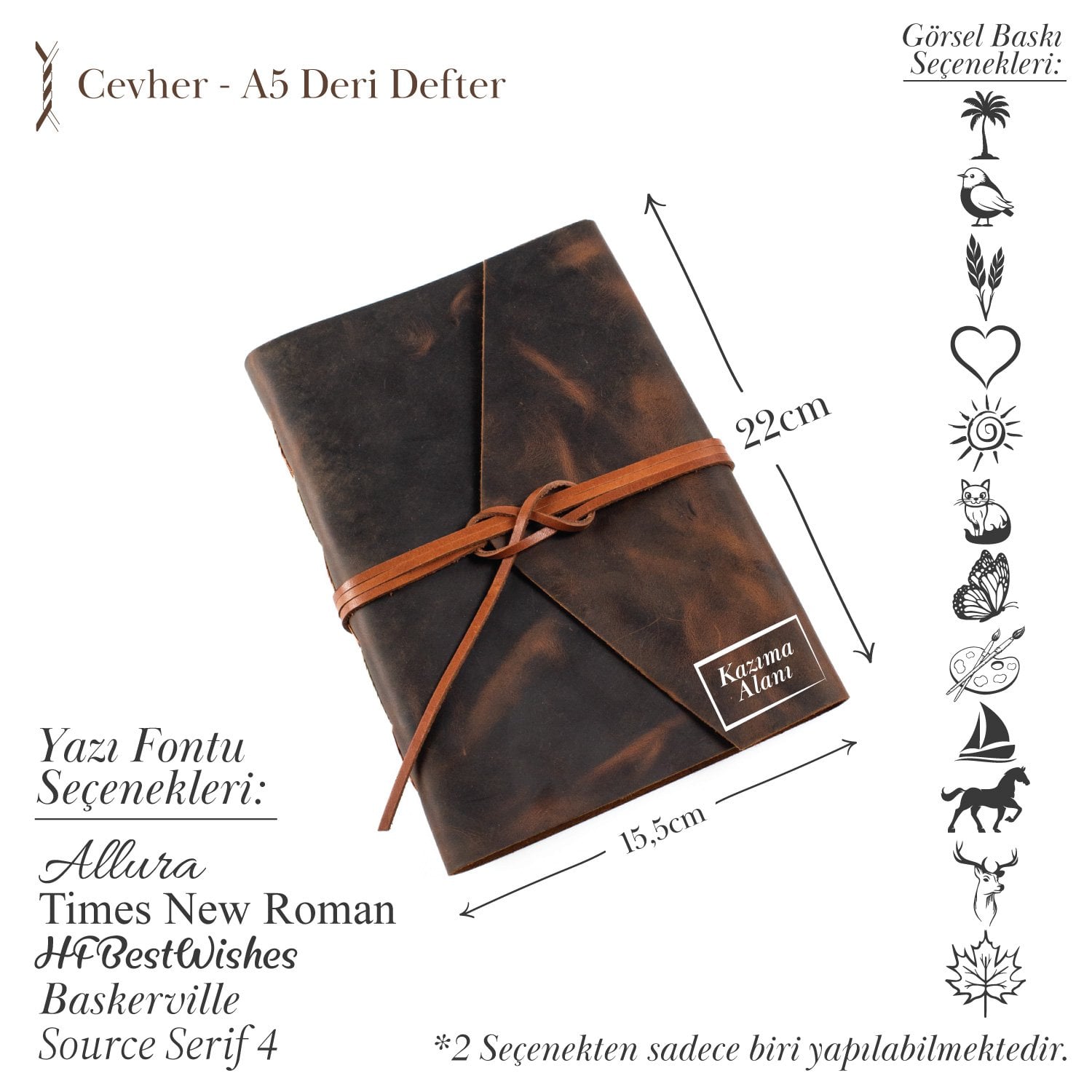 Cevher deri defterde kullanılan deri Crazy Deri olarak bilinen ve üzerine çeşitli yağlar ile sonlandırılan hakiki dana derisidir.