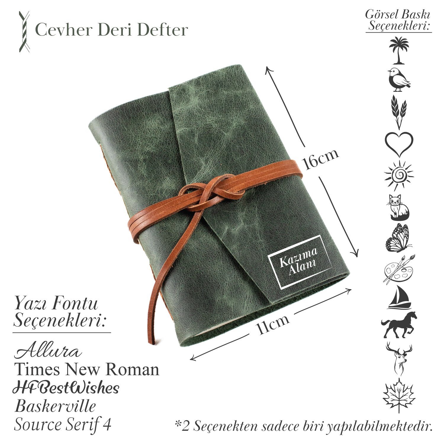 - Deri defterin kağıtları; A6 standartlarında 10.5 x 14.8 cm, 80 gram, çizgisiz ivory kağıttır.