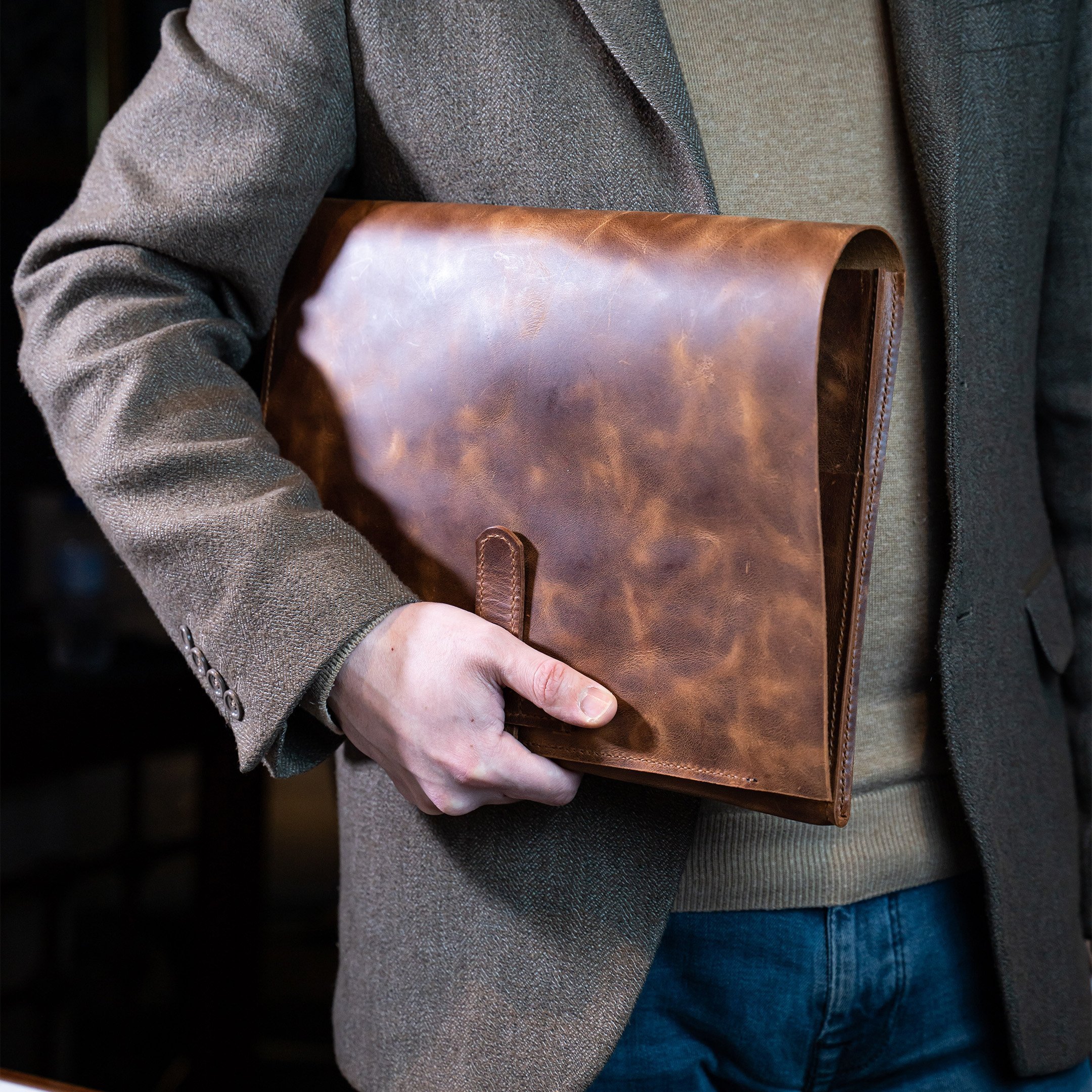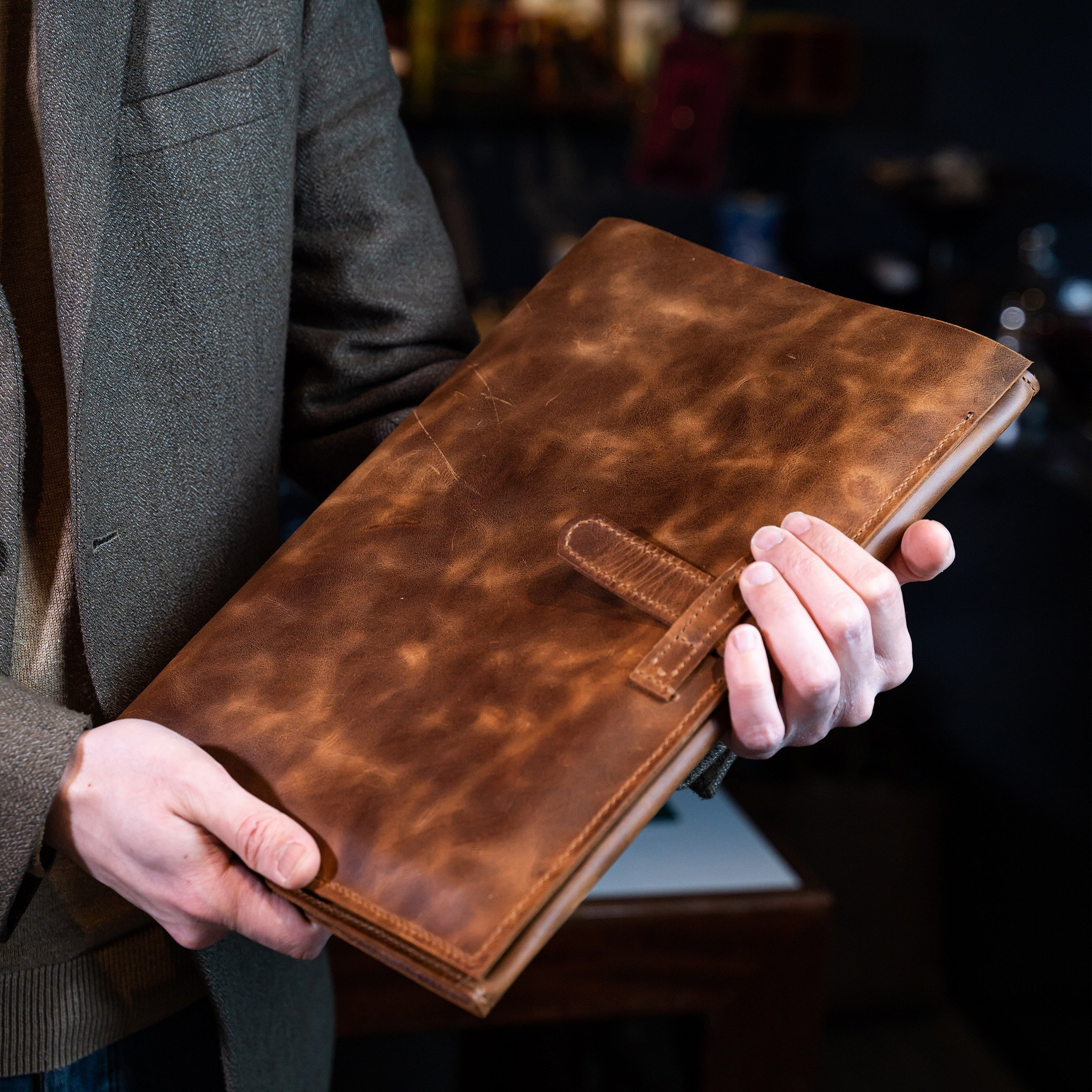 Deri organizerde kullanılan deri crazy deri olarak bilinen ve üzerinde çeşitli yağlar ile sonlandırılan hakiki dana derisinin "dolaplı crazy" versiyonudur. Bu deriyi normal crazy deri gibi elinizle büker veya kırıştırırsanız hızlı bir şekilde renk değişimi yapmaz, kendinden efektlidir. Deri üzerinde oluşan çeşitli çizikler deriye eskitme - vintage bir görünüm almasını sağlar, normal bir durumdur. Deri yaşayan bir malzemedir ve zamanla parlayıp, koyu renk alacaktır.