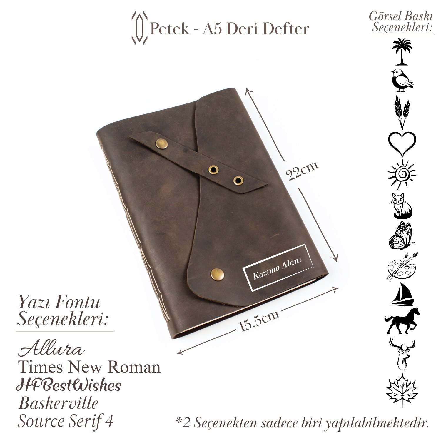 Petek deri defterde kullanılan deri Crazy Deri olarak bilinen ve üzerine çeşitli yağlar ile sonlandırılan hakiki dana derisidir.