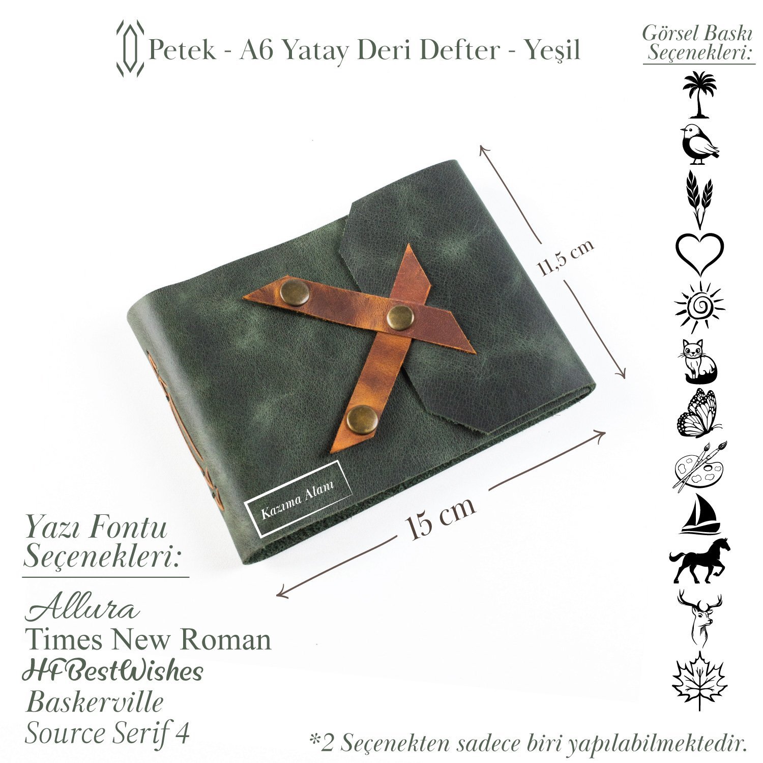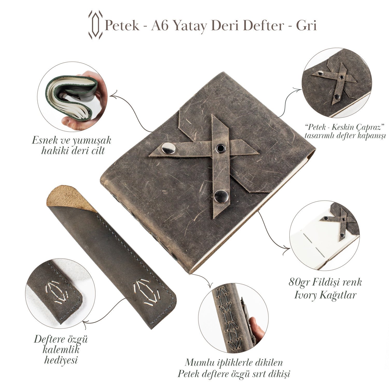 Petek deri defterde kullanılan deri Crazy Deri olarak bilinen ve üzerine çeşitli yağlar ile sonlandırılan hakiki dana derisidir.